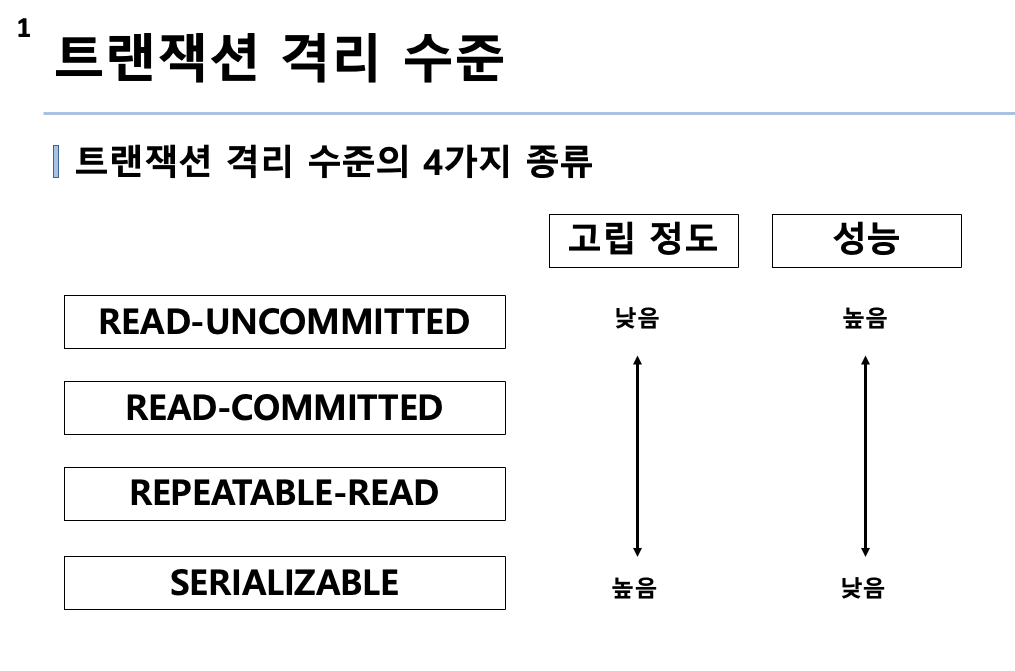 * 격리 수준은 4가지로 나눌 수 있는데, 하위 단계로 갈수록 격리 수준이 높아지지만 동시처리의 성능은 떨어진다.