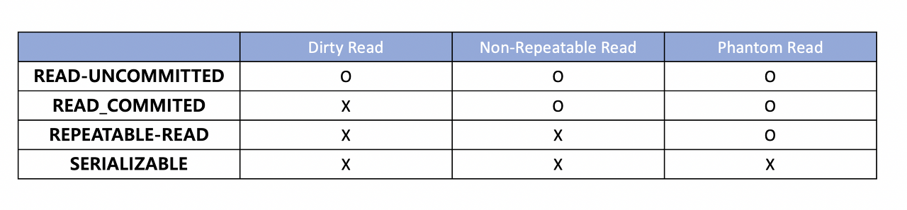 격리 수준은 READ UNCOMMITTED(커밋되지 않은 읽기), READ COMMITTED(커밋된 읽기), REPEATABLE READ(반복 가능한 읽기), SERIALIZABLE(직렬화 가능) 으로 정의할 수 있습니다. 순서대로 READ UNCOMMITTED의 격리 수준이 가장 낮고 SERIALIZABLE의 격리 수준이 가장 높습니다.