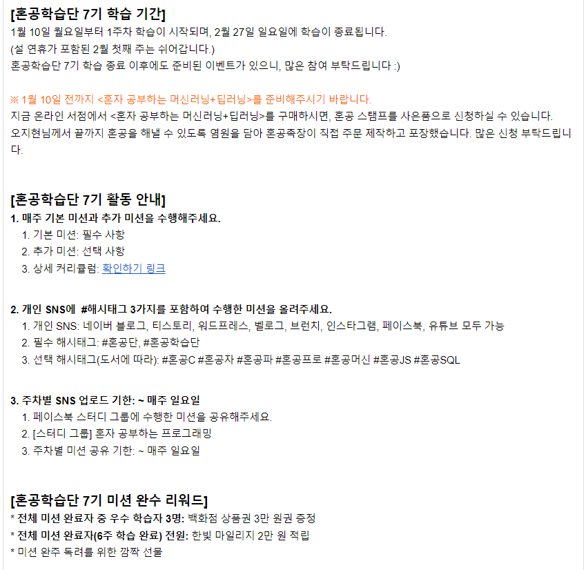 내일부터 시작되는 혼공학습단 7기 화이팅!