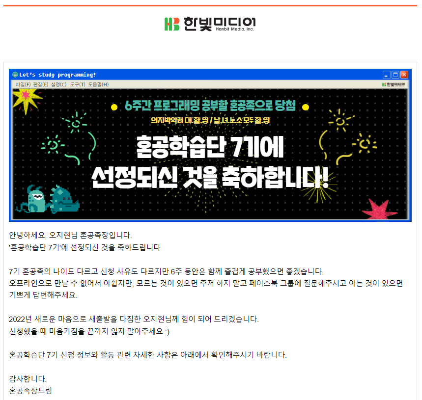 한빛미디어에서 주최하는 혼공학습단에 지원하였고, 혼공학습단 7기에 선정되었다.