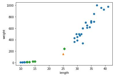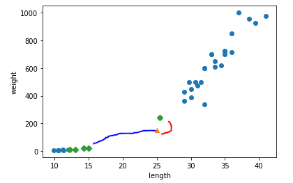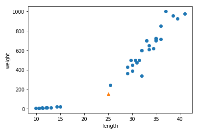 도미로 제대로 분류하는 것을 알 수 있다. 이제 다시 k-최근접 이웃 알고리즘을 활용하여 산점도를 그려본다.