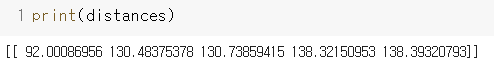 5개의 이웃 중 4개가 빙어임을 확인해볼 수 있다. 분명히 육안으로는 도미가 가까운데 왜 그런걸까? 거리를 확인해보기 위해 거리를 출력해본다.