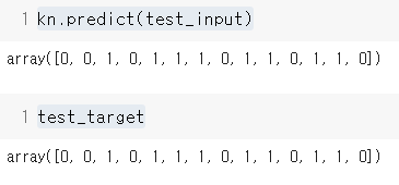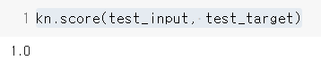 예측 결과와 테스트 세트의 정답이 일치하는 것을 확인할 수 있다. predict 메서드가 반환하는 것은 넘파이 배열이다. 사이킷런 모델에서 사용하는 입출력은 모두 넘파이 배열이다.