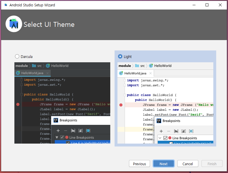 다음은 UI 테마를 선택할 수 있다. Dark모드와 Light모드 중 본인이 편한 환경을 선택한다음 Next를 누르면 된다.