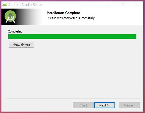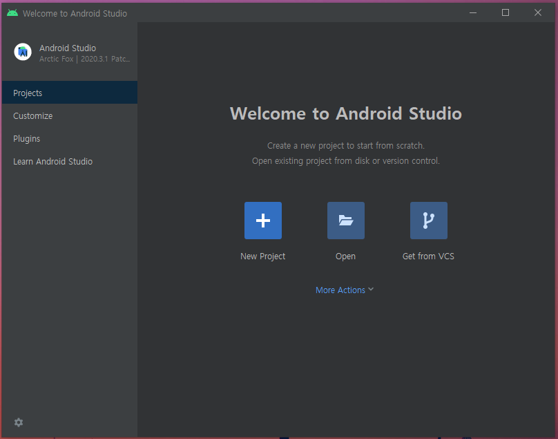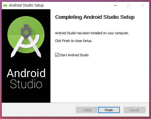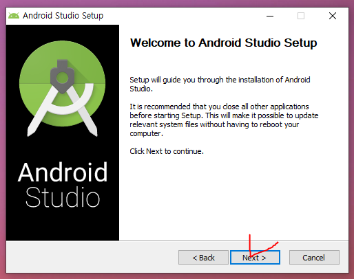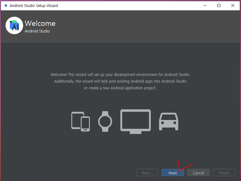 Welcome to Android 화면이 보이면 안드로이드 스튜디오 설치가 완료된 것이다.