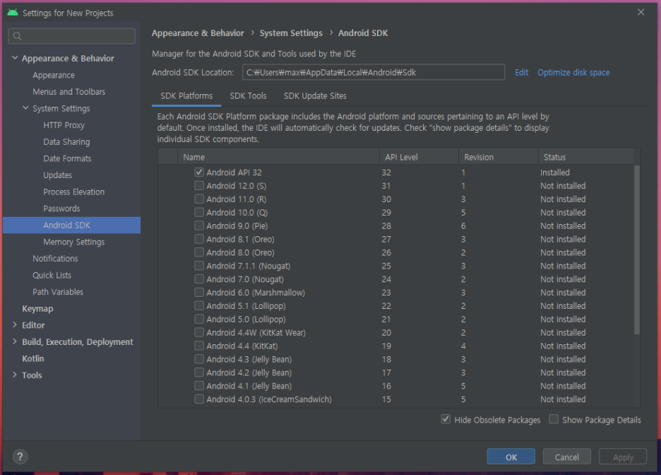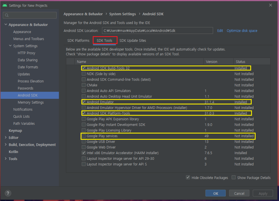 두번째 탭인 SDK Tools를 눌러, Android SDK Build-Tools, Android Emulator, Android SDK Platform-Tools 등의 항목이 최신버전으로 설치되어 있는지 확인한다.