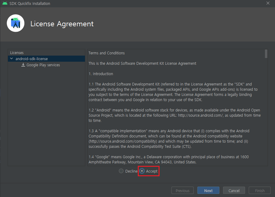설치가 안 된 파일이 있다면 설치가 진행될텐데, 기본 설정이 Decline이라 Accept로 변경해주고 Next를 누른다.