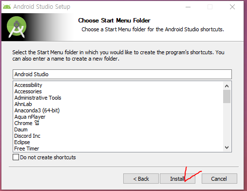 6) 아이콘을 만들고 싶지 않으면 Do not create shortcus를 체크하고, 만들고 싶으면 그대로 Install을 누른다.