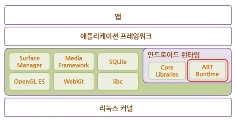 - ART라는 런타임이 탑재되어 있다. 런타임은 프로그램을 실행시키는 엔진같은 것인데, 프로그램의 성능에 영향을 주는 가장 중요한 요소 중 하나이다. 예전엔 속도가 느려 성능 문제가 있었지만, 현재는 지속적으로 개선되어 성능에 문제가 거의 없다.