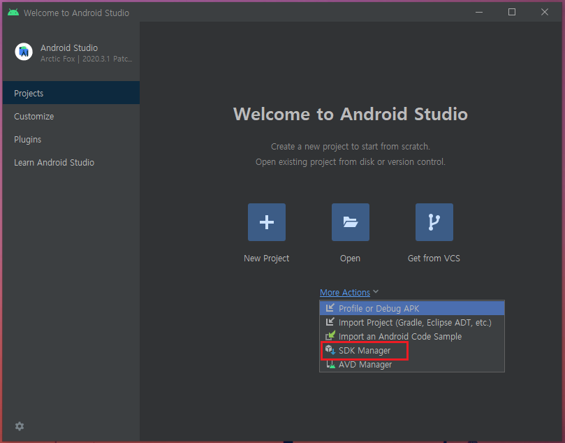 More actions를 클릭한 다음 SDK Manager를 선택한다.