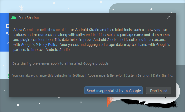 실행 시 이런 창이 뜨는데, 말 그대로 내가 사용하는 데이터를 구글에 전송할 건지 묻는 것이다. 전송한다면 Send usage-- 를, 굳이 전송하고 싶지 않다면 Don't send를 클릭한다.