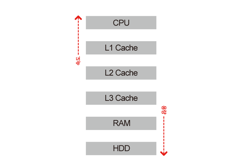 CPU에 가까울수록 더 빨리 데이터를 받을 수 있지만 양이 적다. 기술적 효율성 때문에 이런 순서로 진행이 된다. CPU는 항상 할 일이 있고 비트를 계속 보낼 수 있기 때문에 빨라야 하고, CPU에서 멀어질수록 느려도 된다.