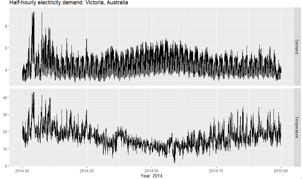 두 시계열은 빅토리아 주 30분단위 전력 수요와 기온이다.
