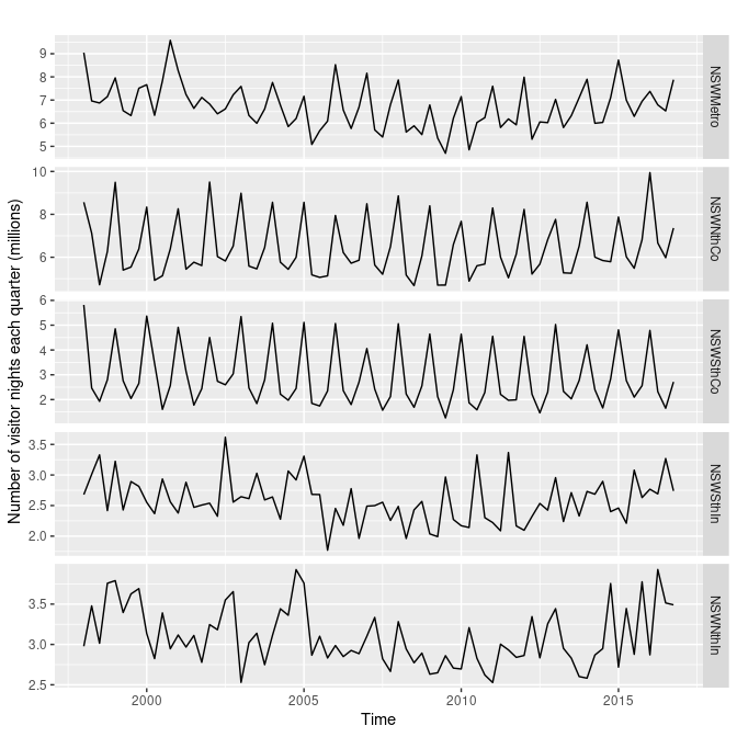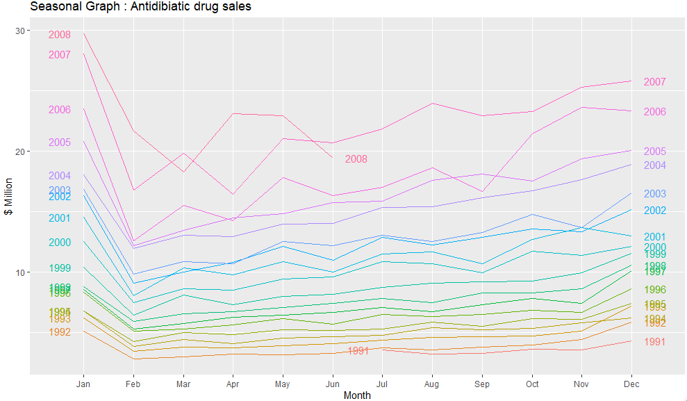 2.2 에서 다뤘던 데이터와 같은 데이터지만 데이터를 계절별로 포개며 나타내고 있다. 중요한 계절성 패턴을 시각적으로 분명하게 보여주고 있다. 특히, 매년 1월에 매출이 크게 뛰는데, 소비자들이 연말에 당뇨병 약을 사재기하는 모습과 2008년 3월의 경기 침체로 매출이 굉장히 작았던 모습을 알 수 있다.