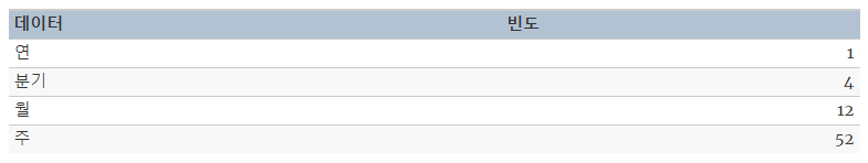 빈도(frequency) 는 특정 구간의 패턴(계절성)이 반복되기 전까지의 관측값의 수를 의미한다. 물리학이나 푸리에(Fourier) 분석에서는 이것을 '주기(period)'라고 부른다.
