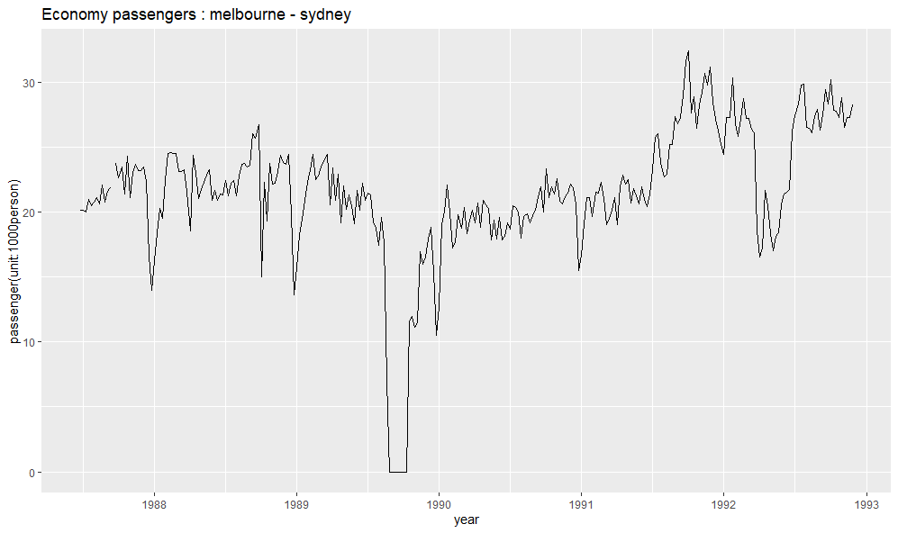 시계열 데이터에서 가장 먼저 그려야 할 요소는 시간 그래프(time plot) 이다. 즉, 관측값을 관측 시간에 따라 인접한 관측값을 직선으로 연결하여 그리는 것이다.