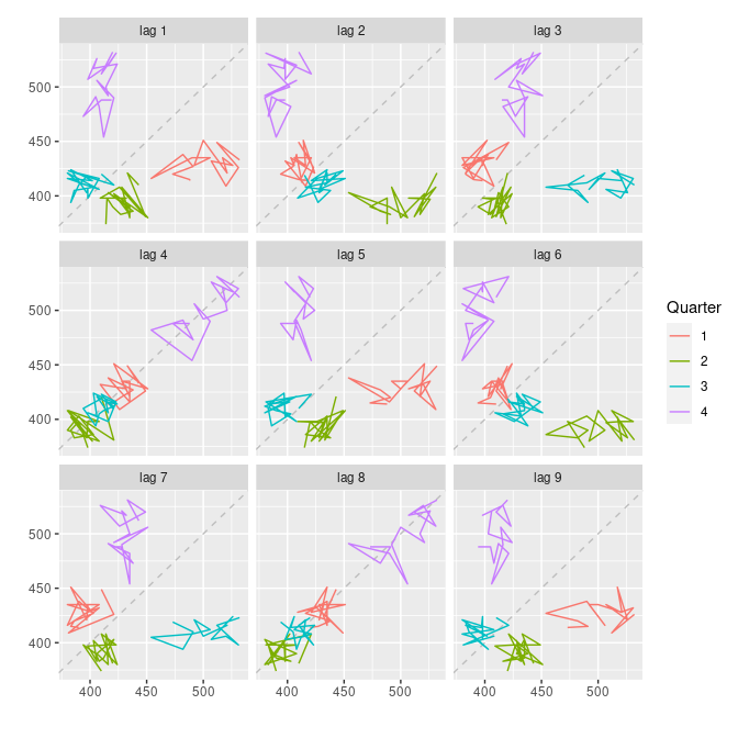 가로축은 시계열의 시차값(lagged value)를 나타낸다. 그래프는 서로 다른 k값에 대하여 세로축을 가로축에 대해 나타낸 것이다. 세로축의 색상은 분기별 변수를 나타낸다. lag 4, lag 8에서 발견할 수 있는 양의 관계는 데이터에 강한 계절성이 있다는 것을 반영한다. lag 2, lag 6 에서는 음의 관계가 나타난다.
