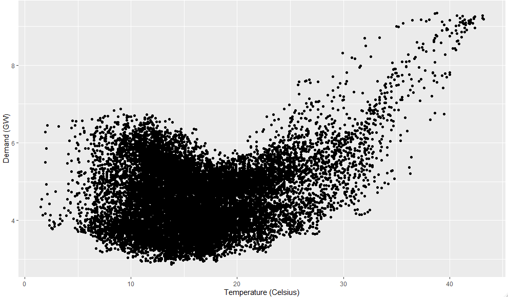 ylab("Demand (GW)") + xlab("Temperature (Celsius)")