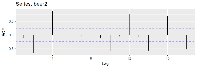 분기별 맥주 생산량에 대한 시차 산점도이다. window() 메서드는 시계열의 부분을 뽑아내는 함수이다.