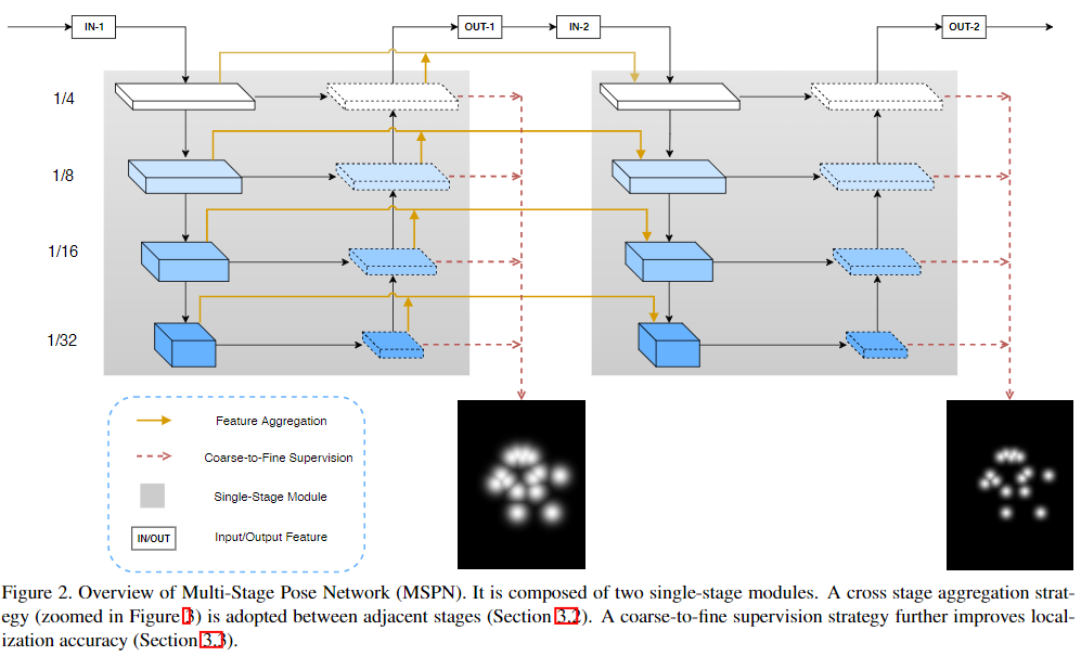 이 연구에서는 두 단계로 하향식(top-down) 접근방식을 채택했는데, 첫번째 단계에서는 기성품인 human detector를 채택하였고, 두번째로는 MSPN을 바운딩 박스에 적용하여 결과를 생성하였다. MSPN은 3가지 개선사항을 제안한다.