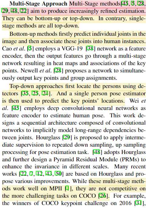 하향식 방법은 먼저 detector를 통해 사람을 찾은 다음 핵심 포인트의 위치를 예측하고, 자세를 추정하기 위해 encoder로 심층 신경망을 사용한다. 이러한 복합 단계의 방법은 MPII 데이터 셋에선 잘 작동하지만 더 복잡한 COCO 데이터 셋에서는 경쟁력이 없다. 최근의 COCO 챌린지 우승자 또한 단일단계 기반의 단순 베이스라인 작업을 진행했고, 이 연구에서는 기존 복합 단계 아키텍처에 몇 가지를 수정하여 다단계(복합단계) 아키텍처가 훨씬 낫다는 것을 보여준다.