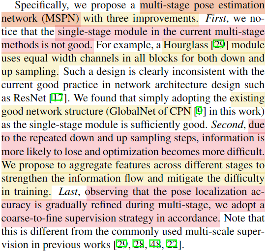 이 연구에서는 위의 문제가 발생하는 것이 설계의 부족 때문이라고 지적하며 3가지 개선된 MSPN(Multi-stage Pose Estimationnetwork)을 제안한다.