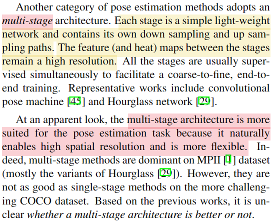 또 다른 방법인 복합 단계 아키텍쳐의 경우 각 단계는 단순한 경량 네트워크이며 자체 다운 샘플링 및 업샘플링 경로를 포함한다. 단계 사이의 feature map (혹은 히트맵) 은 고해상도로 유지된다. 모든 단계는 미세한 지도학습 기반으로 이루어져 있으며, 겉보기에는 multi-stage가 pose estimation에 더 적합해 보인다. 고해상도를 가능하게 하고 더 유연하기 때문인데, 이는 데이터셋마다 다른 결과를 보여준다는 사실을 발견하였다.
