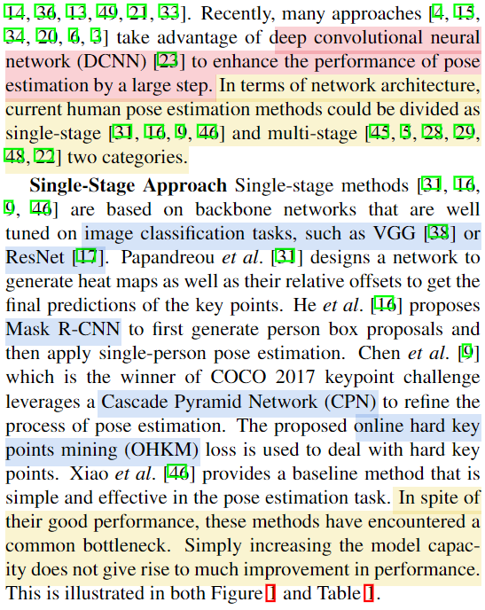 최근 human pose estimation 분야는 심층 신경망 구조를 사용함으로써 빠른 성장을 해오고 있다. 좋은 성능을 보여주는 방법은 단일 단계 를 백본(back-bone) 네트워크로 사용하고 있다. 예를 들어 최근의 COCO (데이터셋을 활용한) 챌린지의 우승자는 Res-Inception 를 사용하였고 baseline은 ResNet 기반이다. pose estimation은 높은 공간 해상도를 요구하기 때문에 깊은 피처의 공간 해상도를 높이기 위해 백본 네트워크 뒤에 upsamling 또는 deconvolution 하는 과정이 추가된다.