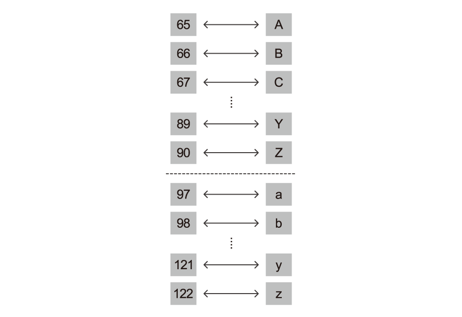 컴퓨터가 숫자가 아니라 문자나 다른 것들을 나타내기 위해 하는 것이 있을까? 컴퓨터 업계에서는 숫자를 알파벳 문자에 대응시키는 표준 방법을 채택하였다. ASCII 는 아스키라고 읽으며 글자를 10진수로 대응하는 것이다.