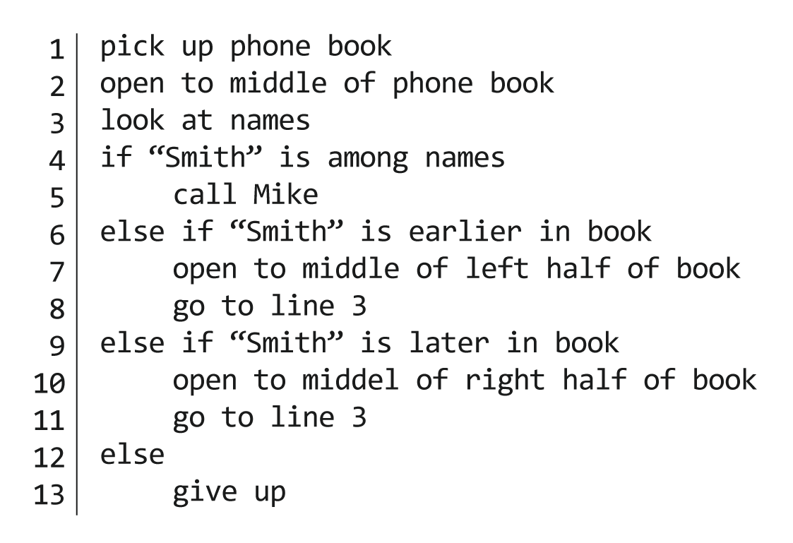 전화번호부에서 Mike Smith를 찾을 때의 알고리즘을 수도 코드로 표현한다면 위와 같은 알고리즘으로 진행될 것이다.