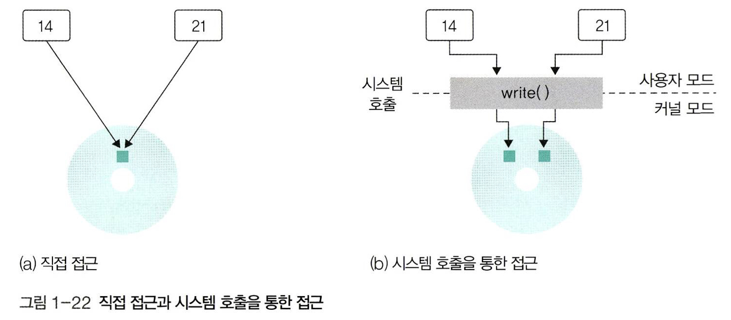 - 시스템 호출을 통한 접근 : 누군가에게 요청하여 작업결과만 받기 때문에, 커피머신(컴퓨터 자원)이 망가지는 일을 막을 수 있다. 일반적으로 이처럼 시스템 자원을 사용할 수 있도록 시스템 호출을 사용한다.