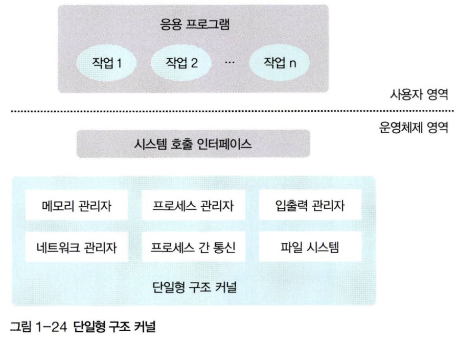 - 단점 : 모듈이 하나로 묶어였기 때문에 버그나 오류를 처리하기 어렵고, 여러 기능이 서로 연결되어 있어 상호 의존성이 높아 작은 결함이 시스템 전체로 확산될 수 있다. 수정이 어렵기 때문에 다양한 환경의 시스템에 적용하기 어렵다. 현대의 운영체제는 매우 크고 복잡하기 때문에 단일형 구조를 구현하기가 어렵다.