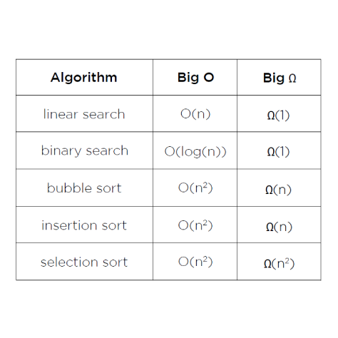 각 정렬을 big-O 시간복잡도와 big-Ω 시간복잡도로 나타내면 위와 같다.