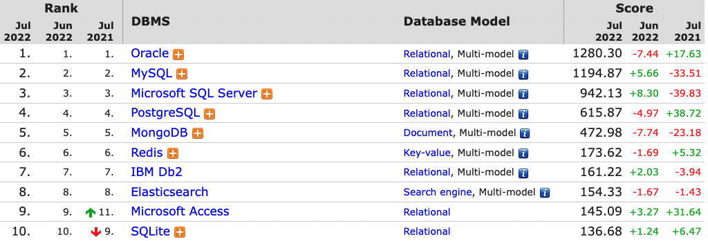 세계 DBMS 랭킹을 통해 확인해보니 작성일인 2022년 7월 기준 Oracle, MySQL, MSSQL이 탑3에 있음을 알 수 있다.