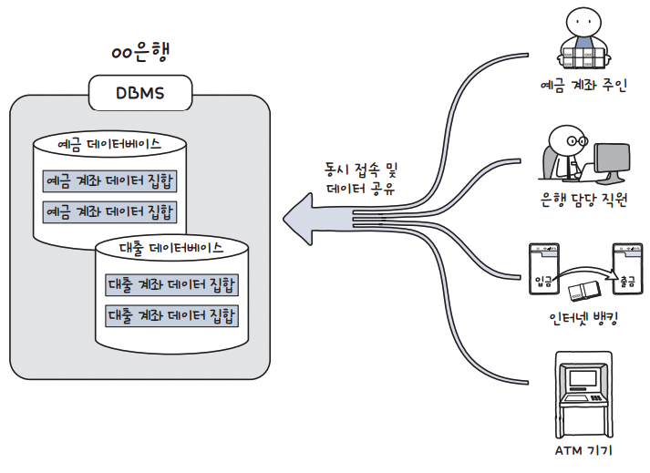 데이터베이스는 일반적으로 여러 명의 사용자나 여러 응용 프로그램에게 공유가 가능하며 동시 접근이 가능해야 한다. 은행처럼 여러명의 계좌 정보를 모아둔 것이 DBMS이다. 하나의 계좌를 통해 은행 직원, 계좌의 주인, ATM, 인터넷 뱅킹 등을 통해 접근이 가능하다.